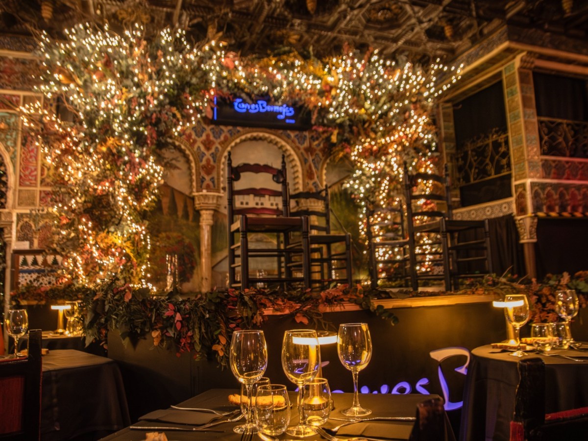 La impresionante sala Torres Bermejas reproduce el interior de las Torres Bermejas de la Alhambra de Granada , con paredes con motivos árabes, azulejos y techos artesonados de madera.